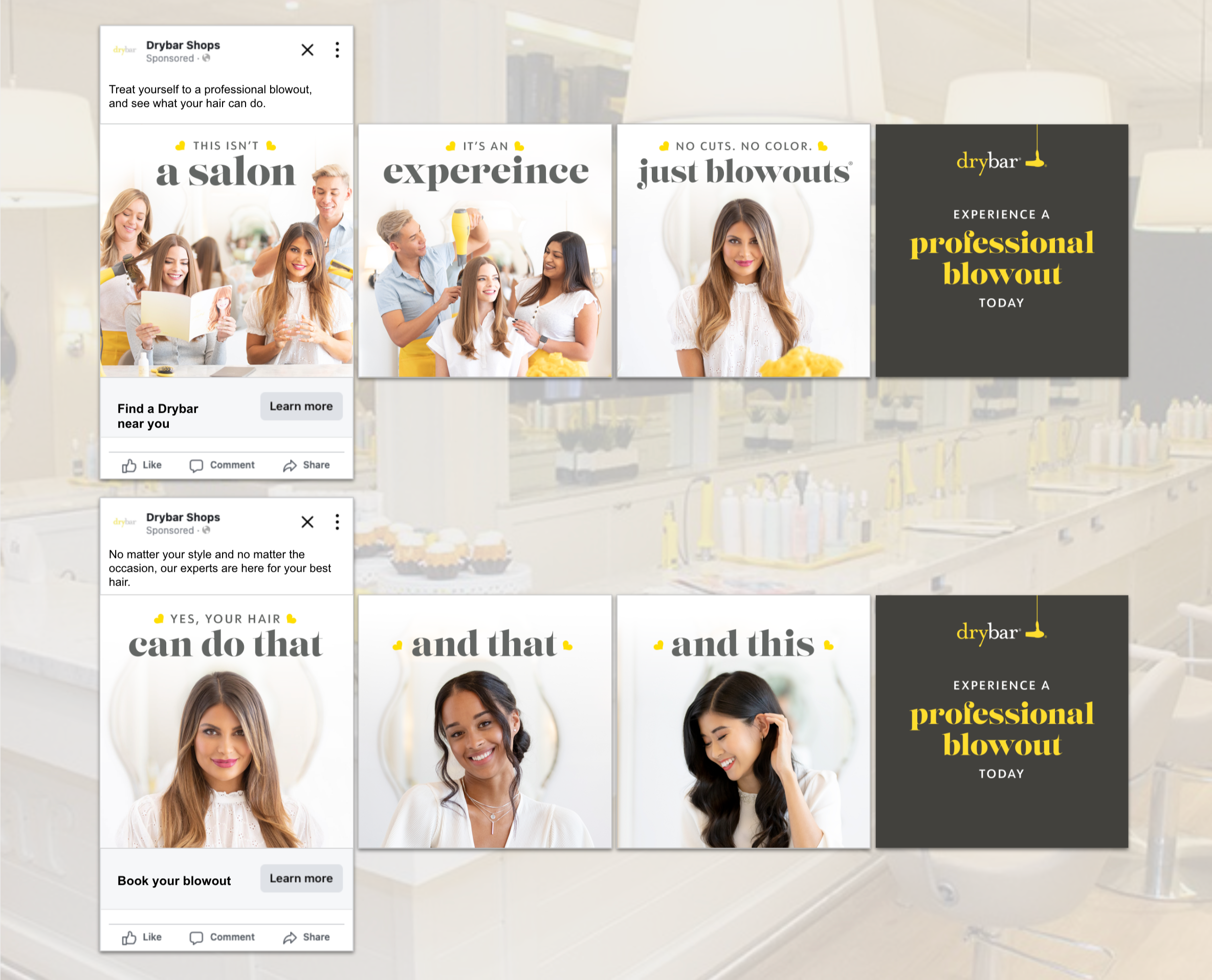 These efforts not only outperformed previous paid social benchmarks but also introduced a new strategic lens for the brand positioning Drybar as an experience, not just a salon. This shift laid the foundation for campaign slogans like “Mind Blown” and “Yes, your hair can do that.”