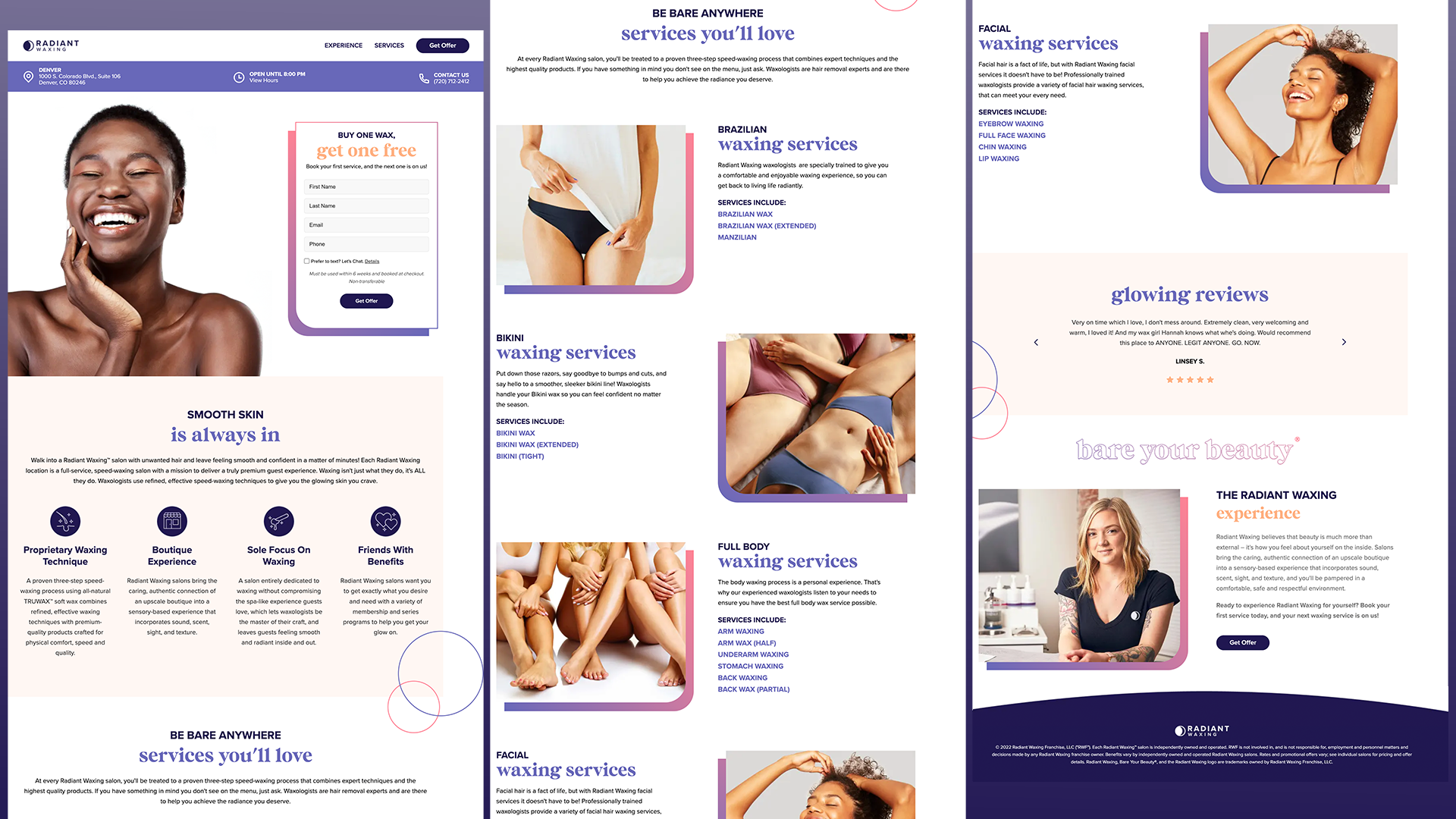 As part of the rebrand from Lunchbox Wax to Radiant Waxing, the brand also needed a new landing page. I led the effort internally, ensuring the design, messaging, and user flow aligned with the updated identity and supported the broader campaign goals.